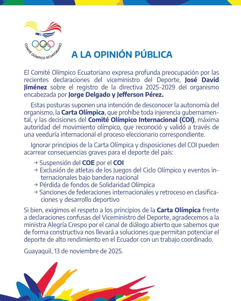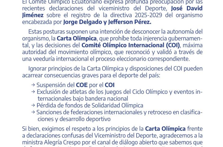 2 min de lectura Comité Olímpico Ecuatoriano expresa preocupación por declaraciones del Viceministro del Deporte y pide respeto a la autonomía deportiva