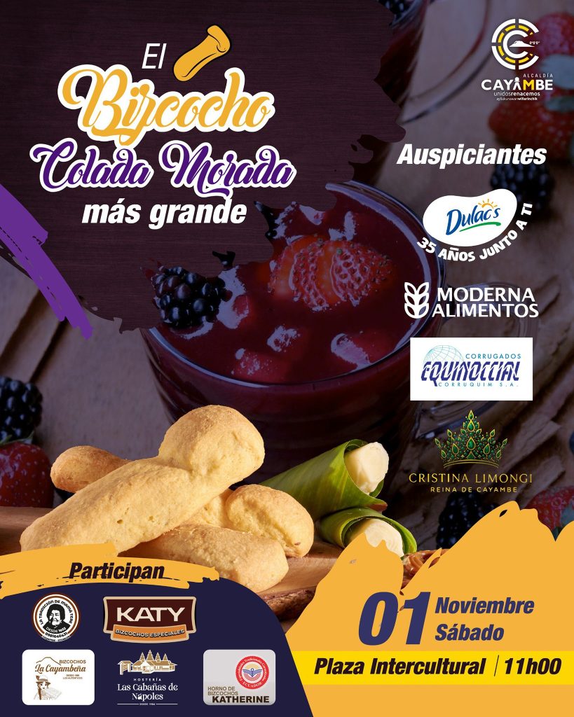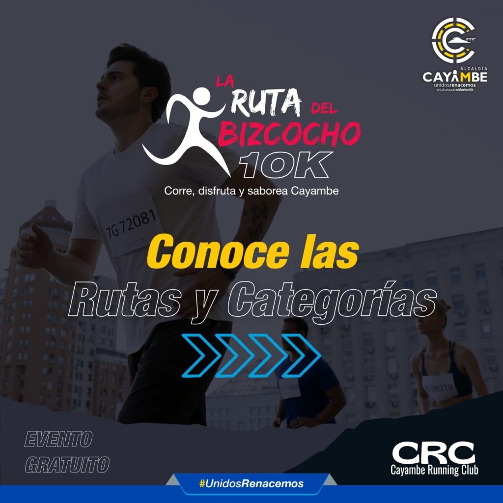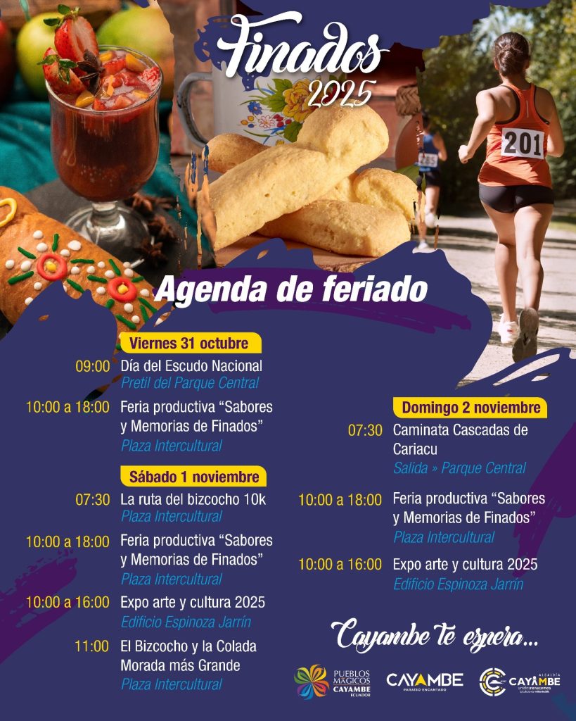 - La Ruta del Bizcocho 10K (¡Evento Gratuito!): Corre, disfruta y saborea Cayambe. Esta popular carrera se realiza el sábado 1 de noviembre con diferentes distancias que se adaptan a toda la familia, con salida y llegada en la Plaza Intercultural: