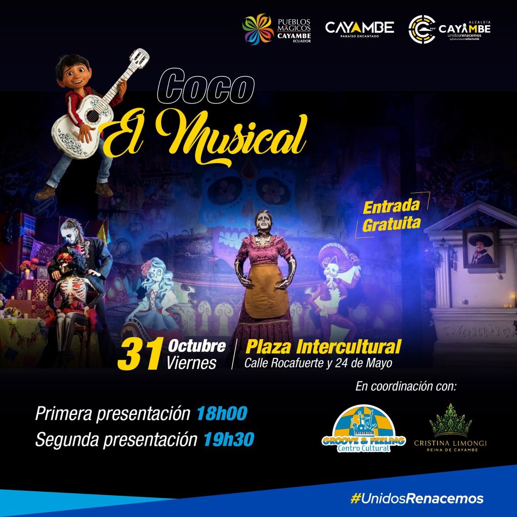Coco El Musical (Entrada Gratuita): Un espectáculo perfecto para la noche de viernes 31 de octubre en la Plaza Intercultural. Disfruta de la magia de esta obra con dos funciones: 18h00 y 19h30.