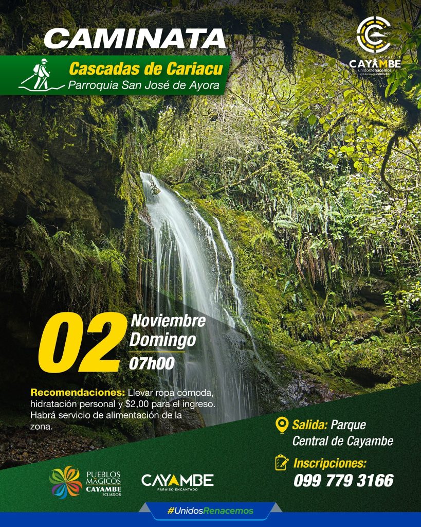 - Caminata a las Cascadas de Cariacu: El domingo 2 de noviembre a las 07:00 se realizará una caminata hacia las impresionantes Cascadas de Cariacu, ubicadas en la hermosa Parroquia San José de Ayora. La salida es desde el Parque Central de Cayambe. Una oportunidad única para conectar con la naturaleza, respirar aire puro y maravillarse con las caídas de agua cristalina.
