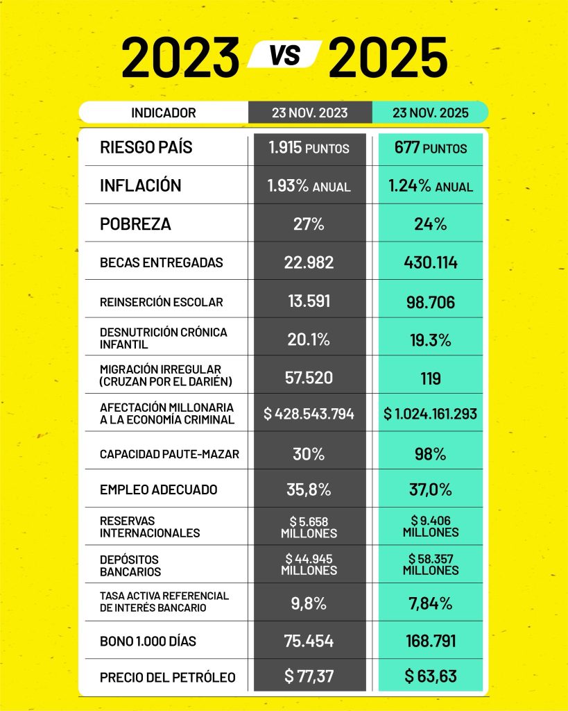 El Gobierno Nacional presentó este domingo el nuevo balance de gestión 2025, un reporte estadístico que contrasta los indicadores actuales con los de noviembre de 2023. El documento oficial resalta la estabilización de la macroeconomía y un endurecimiento en la lucha contra el crimen organizado.