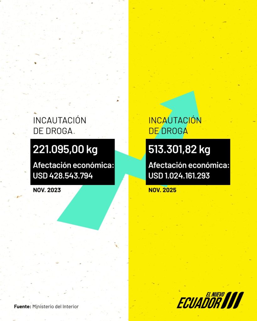 El reporte indica que se pasó de 221 toneladas de droga en 2023 a 513 toneladas en el presente año. Este incremento ha generado una pérdida de 1.024 millones de dólares para la economía criminal. Además, se destaca la captura de 31 «Objetivos de Alto Valor» (cabecillas), un indicador que estaba en cero hace dos años.
