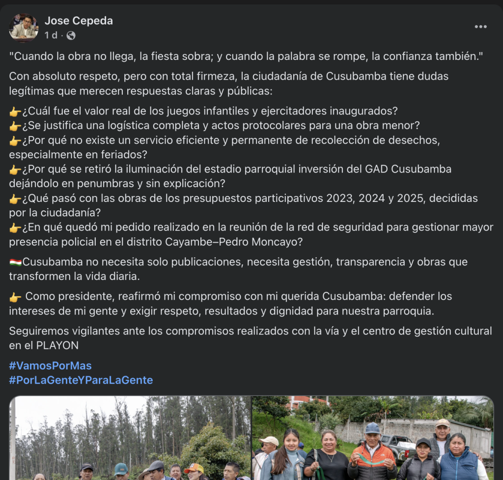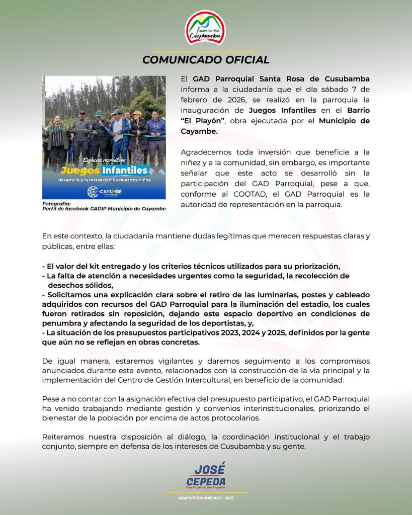 La respuesta no se hizo esperar. José Cepeda, presidente del GAD Parroquial de Santa Rosa de Cusubamba, emitió un duro comunicado cuestionando la polémica de las obras en Cusubamba. Cepeda calificó el evento de inauguración como desproporcionado («logística completa y actos protocolarios») para lo que considera una «obra menor», mientras existen necesidades urgentes desatendidas.